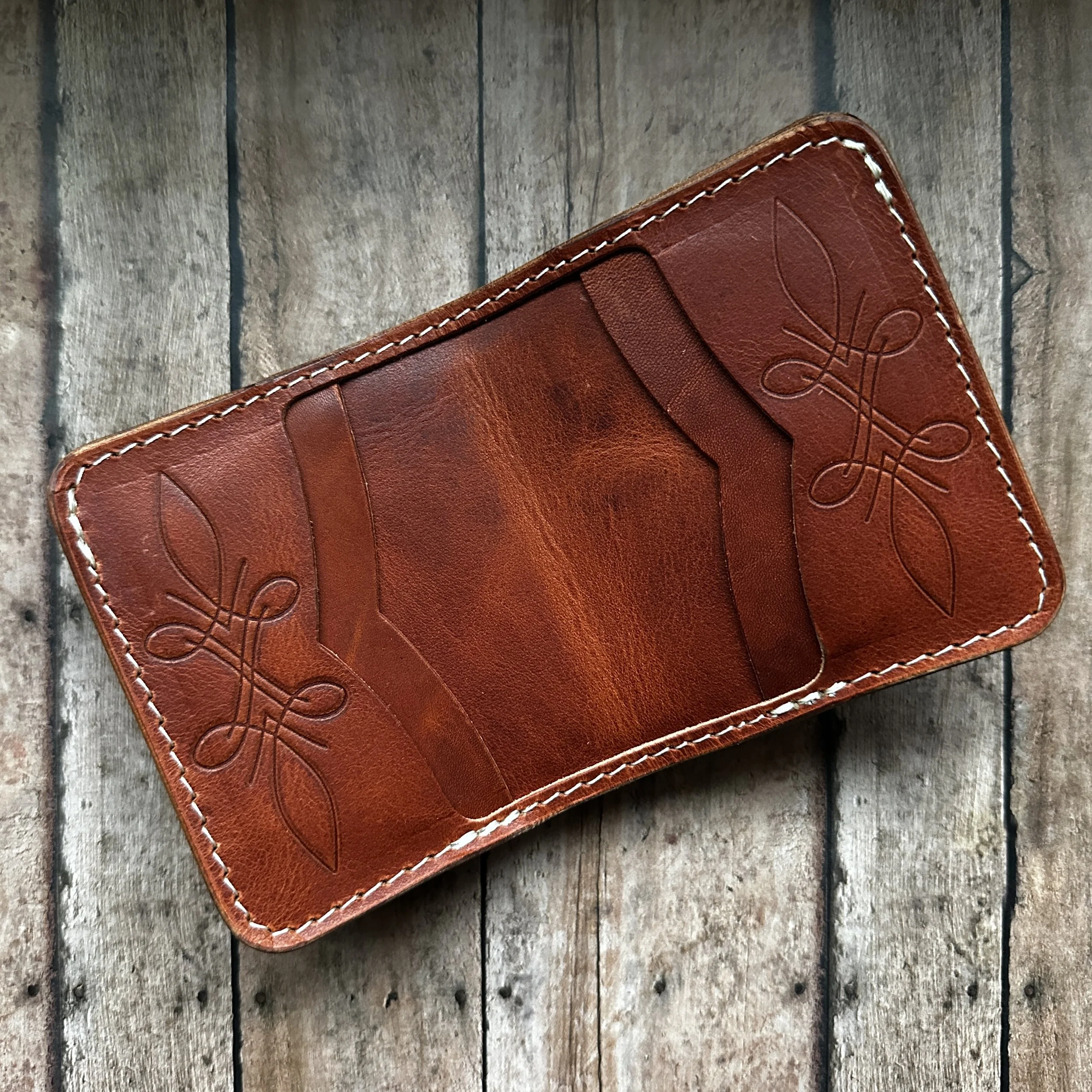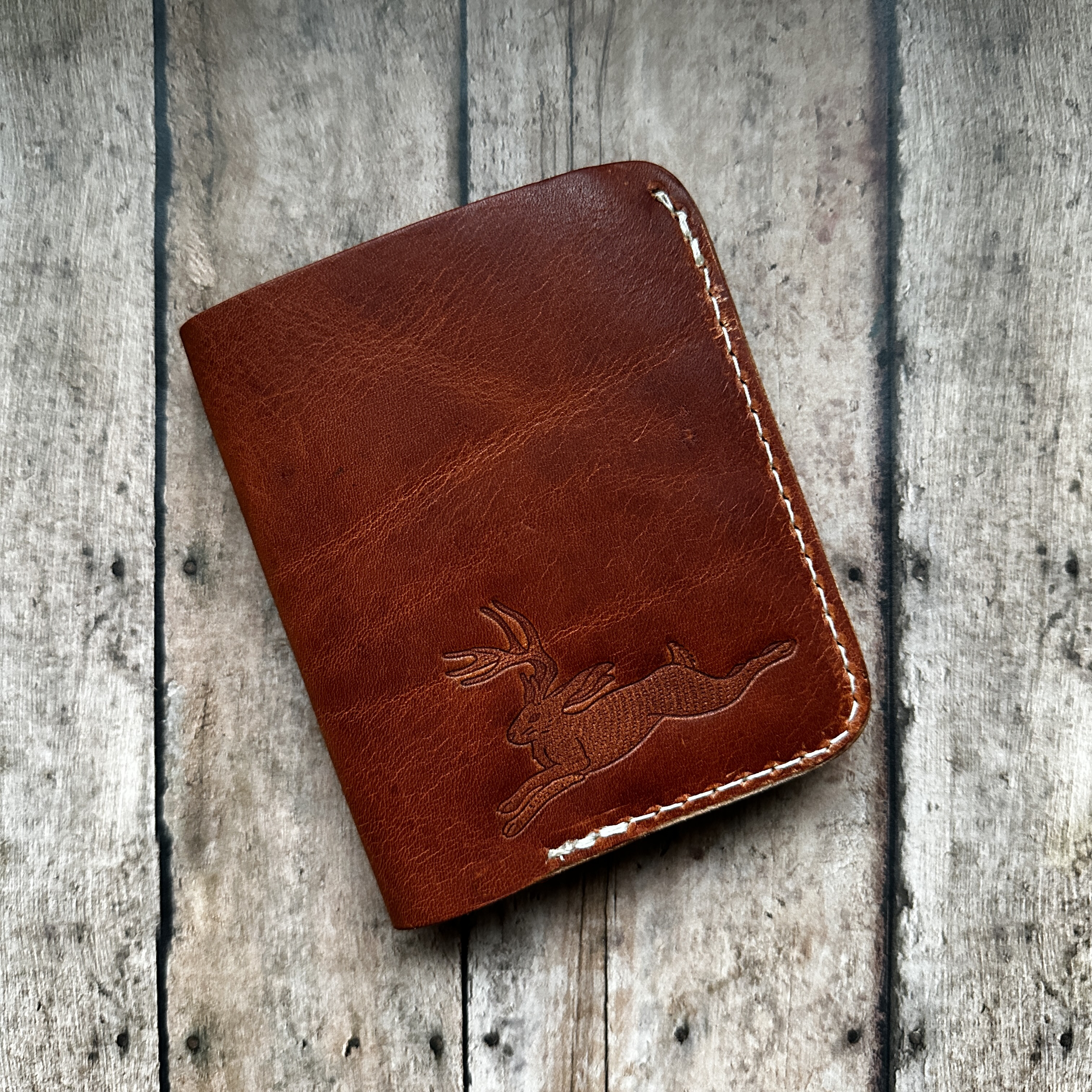 The inside stamps are universal across all wallet styles; only varying in the horizontal or vertical orientation of the pockets. There are five different external stamps to choose from, all drawn exclusively for this collection.