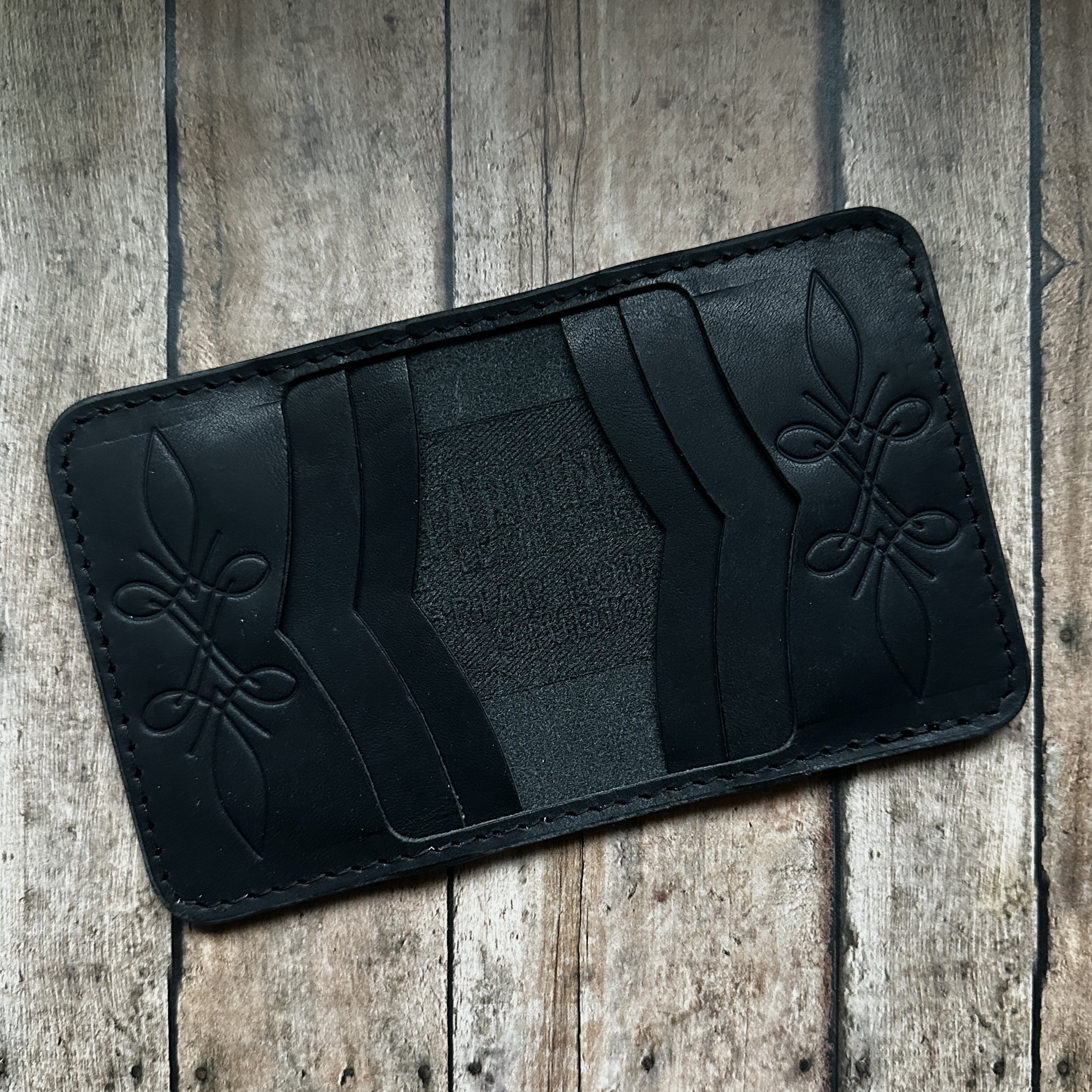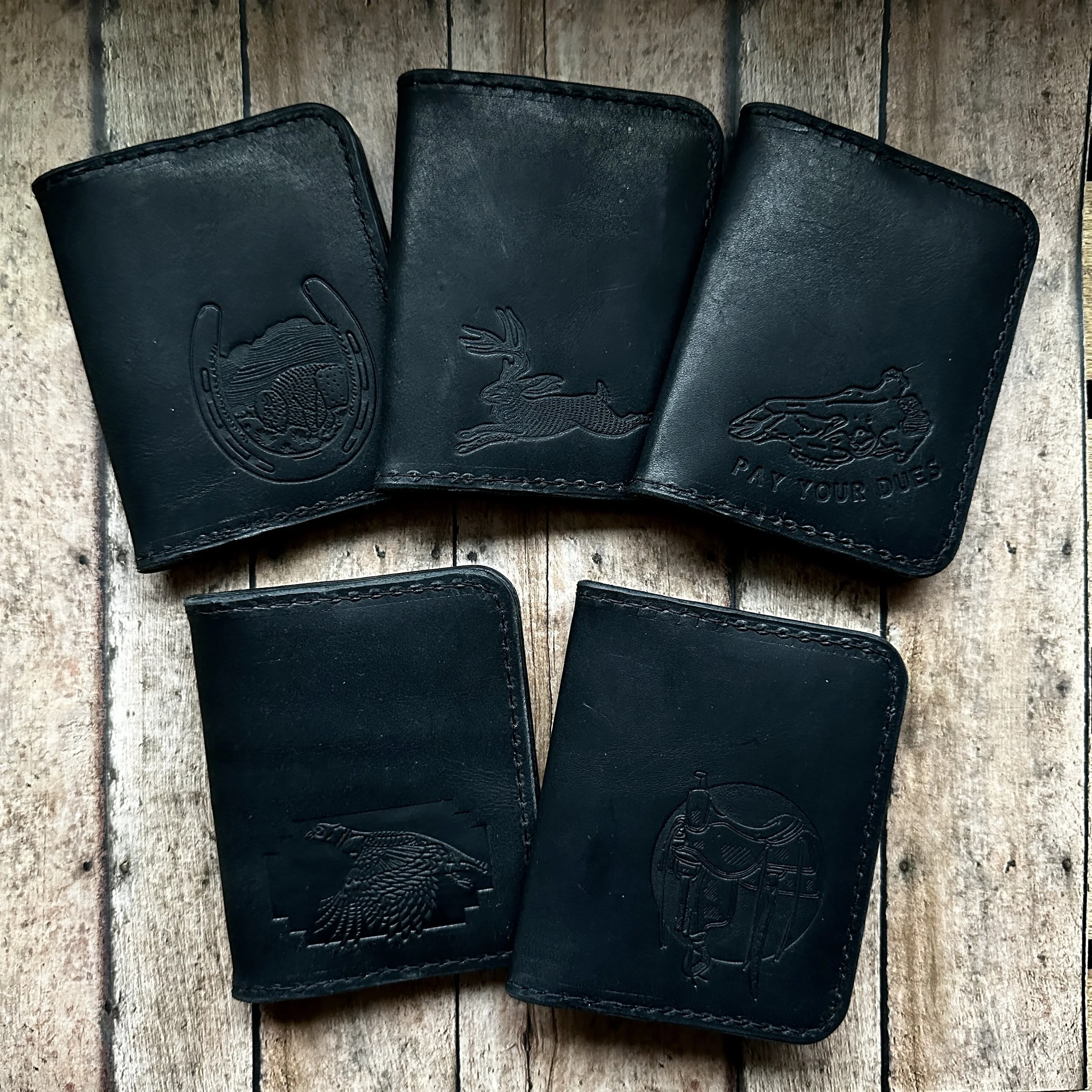 The inside stamps are universal across all wallet styles; only varying in the horizontal or vertical orientation of the pockets. There are five different external stamps to choose from, all drawn exclusively by Briar House Studio for this collection.