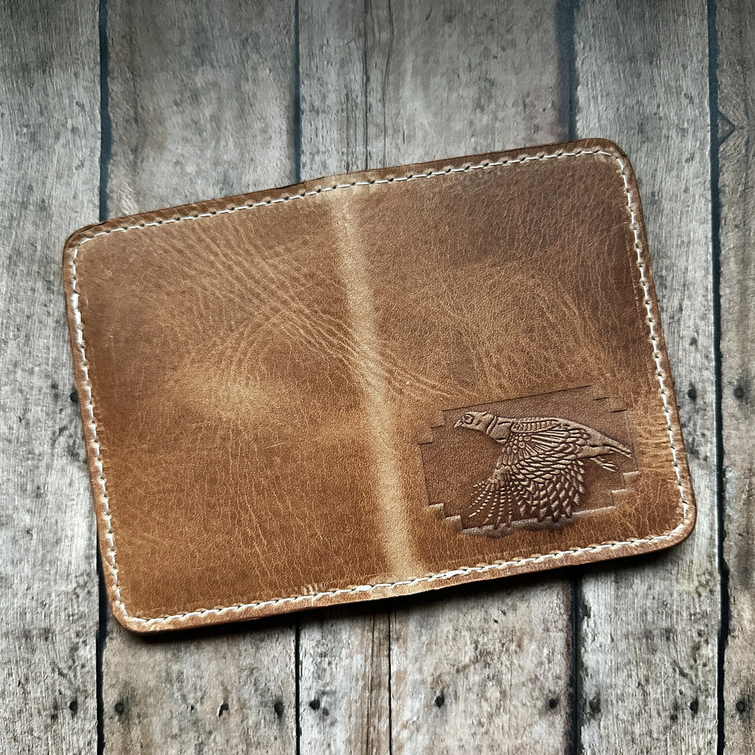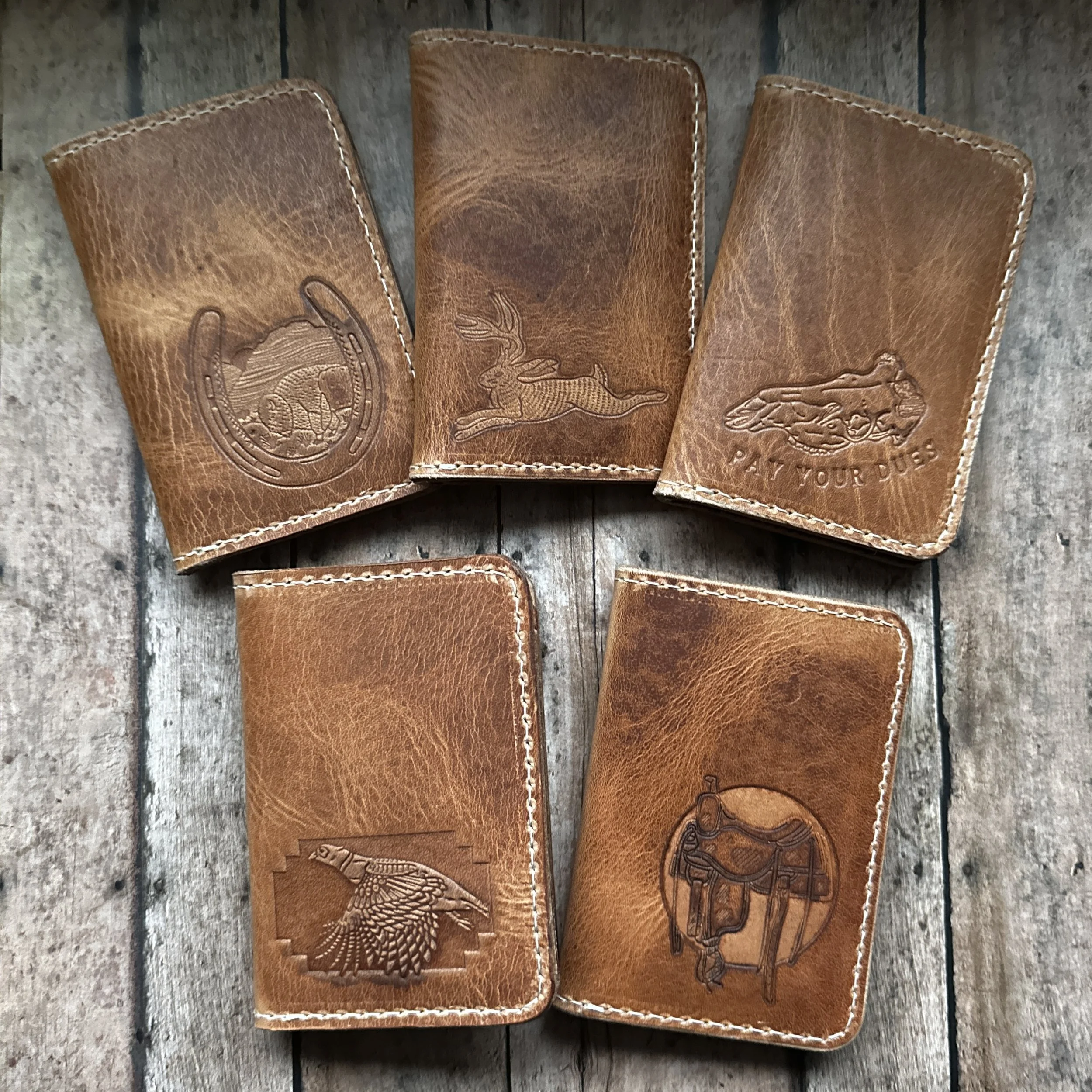 The inside stamps are universal across all wallet styles; only varying in the horizontal or vertical orientation of the pockets. There are five different external stamps to choose from, all drawn exclusively for this collection.